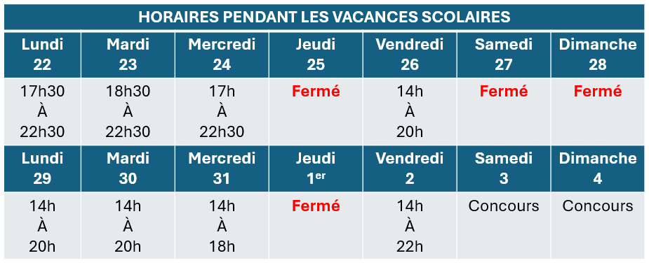 15 déc. 2025 - Horaires pendant les vacances scolaires