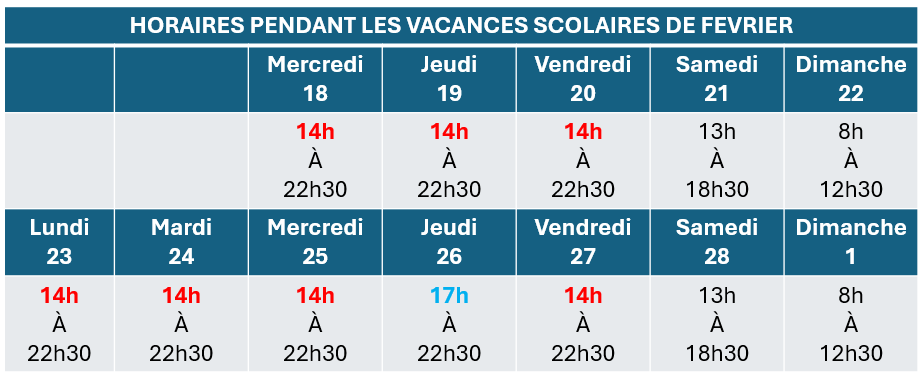 Merci de vous reporter au tableau joint pour connaître les horaires du Gymnase Ampère pendant les vacances scolaires.